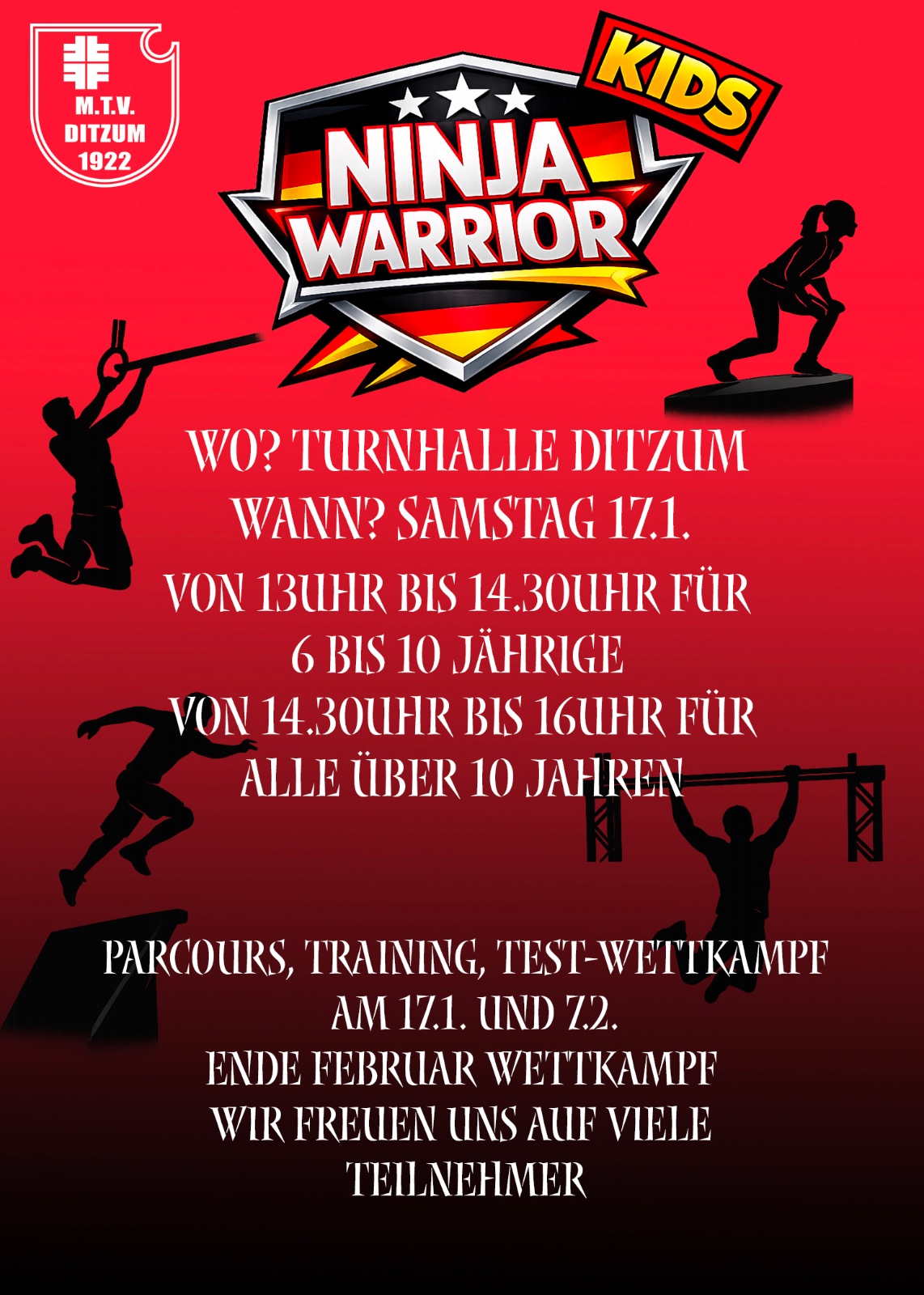 Am Samstag, 17. Januar und Samstag, 7. Februar finden zwei Traningsnachmittage für den "NinjaWarrior Ditzum"-Wettbewerb statt. Der Wettkampftag selbst wird in der letzten Februarhälfte stattfinden.