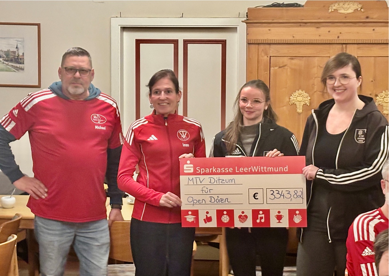 Eine Spendensumme von 3.343,82 € war das Ergebnis des Sponsorenlaufs im Rahmen unserer Sportwoche. Am Mittwoch übergaben die MTV-Vorstandsmitglieder Frauke Schröder und Martje Pruin die Spende offiziell an den Open Dören e.V. aus Bunde.